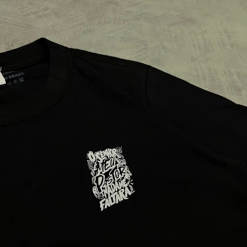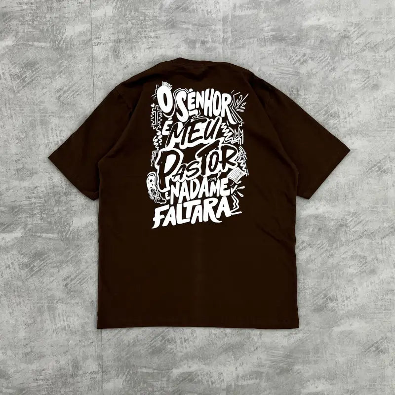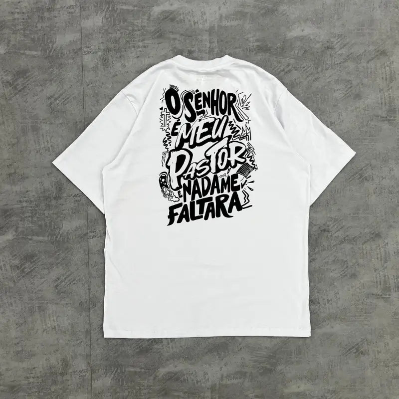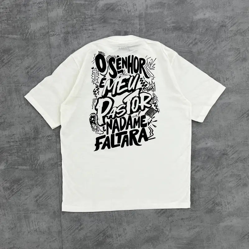 Camiseta com a frase “O Senhor é meu Pastor e nada me faltará”, estilo casual e confortável.